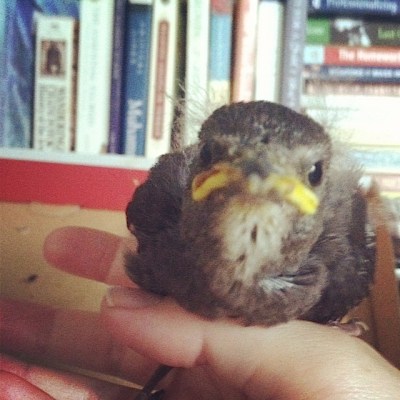 Touchy things are baby birds. Their diets are varied- you have to know what each species diet looks like. You have to be willing to get up and feed at night, as with any other baby. They require a certain level of heat- especially those not yet feathered. I felt a little like I was flying by the seat of my pants with this little one. For once, it has worked. Sometimes the trick is knowing when to intervene and when to not. If a bird is a nestling and lacking all or most feathers, chances are slim they’ll survive outside of the nest. Sometimes it’s possible to place them back in the nest- other times it is not. That is when you intervene. If the bird is entirely feathered out and hard to catch- leave it be. If the bird is feathered out and injured- different story. Basically, it comes down to using a bit of common sense, and being willing to watch for adult birds caring for the baby. Usually they are.