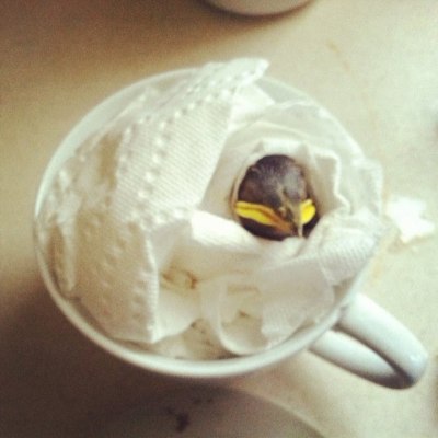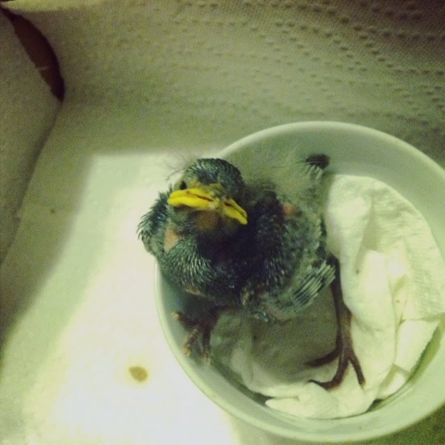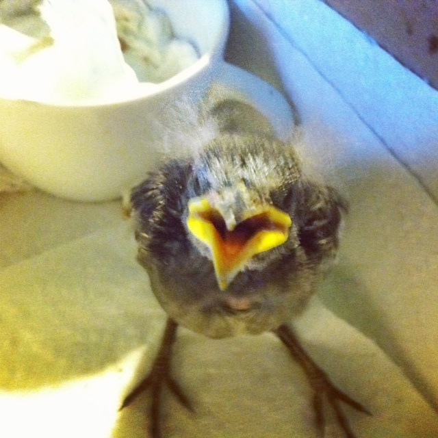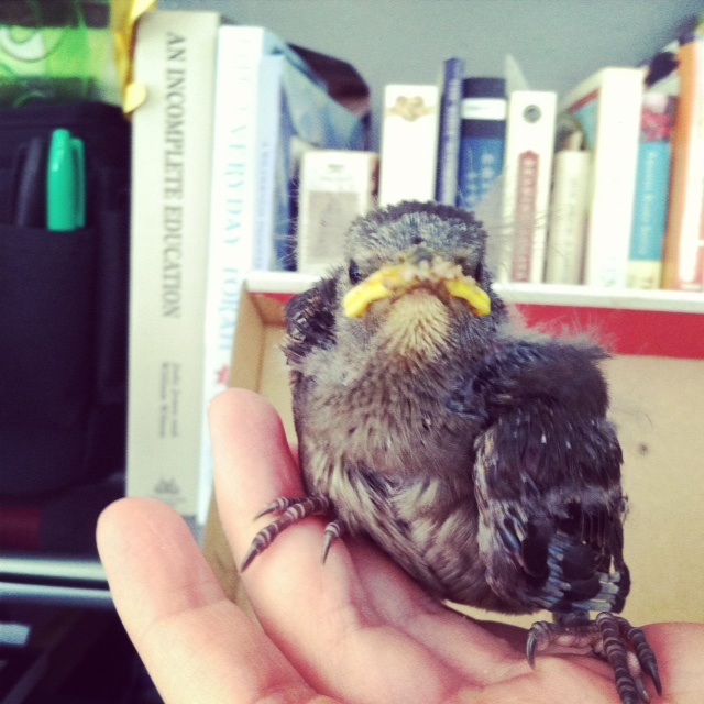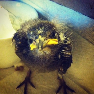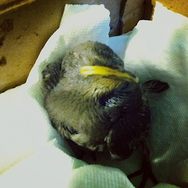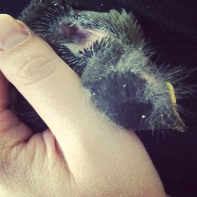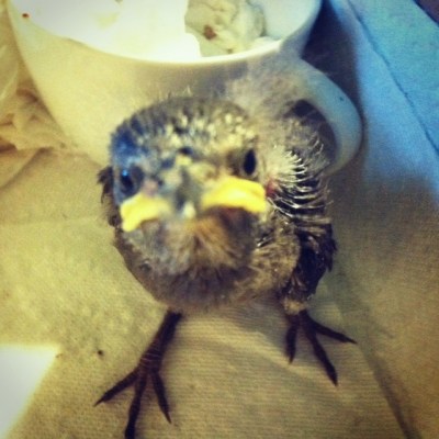 Touchy things are baby birds. Their diets are varied- you have to know what each species diet looks like. You have to be willing to get up and feed at night, as with any other baby. They require a certain level of heat- especially those not yet feathered. I felt a little like I was flying by the seat of my pants with this little one. For once, it has worked. Sometimes the trick is knowing when to intervene and when to not. If a bird is a nestling and lacking all or most feathers, chances are slim they’ll survive outside of the nest. Sometimes it’s possible to place them back in the nest- other times it is not. That is when you intervene. If the bird is entirely feathered out and hard to catch- leave it be. If the bird is feathered out and injured- different story. Basically, it comes down to using a bit of common sense, and being willing to watch for adult birds caring for the baby. Usually they are.