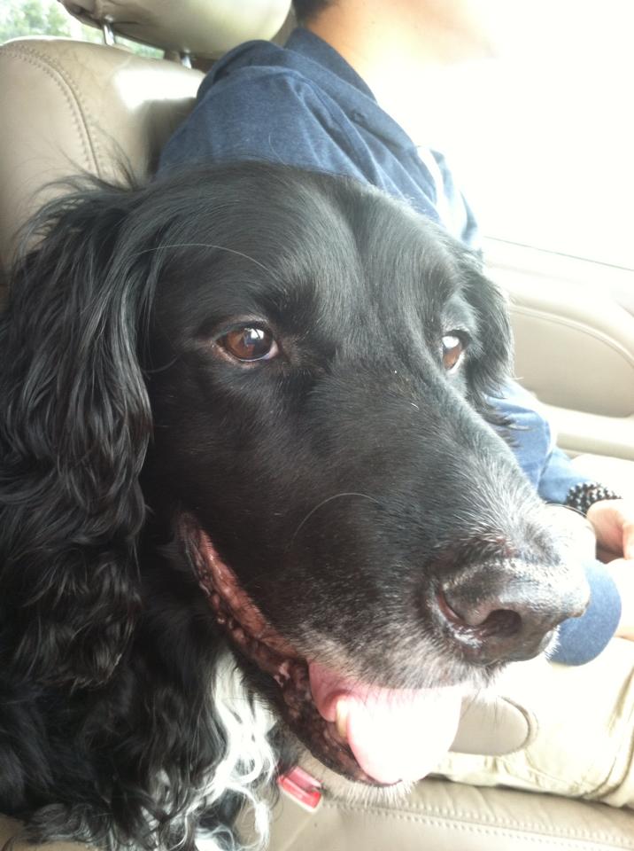 He also loved a car ride and would sit stoically in the front seat of my car, with the seat belt around his deep chest- always looking straight ahead. He reminded me of Jan Karon’s Barnabas in the Mitford novels, and assorted James Herriot characters. He was a listener, a cat food junkie, and always patient with children, cats and the occasional starling who enjoyed preening on Darby’s back. All of that isn’t something you breed for- it just happens along.