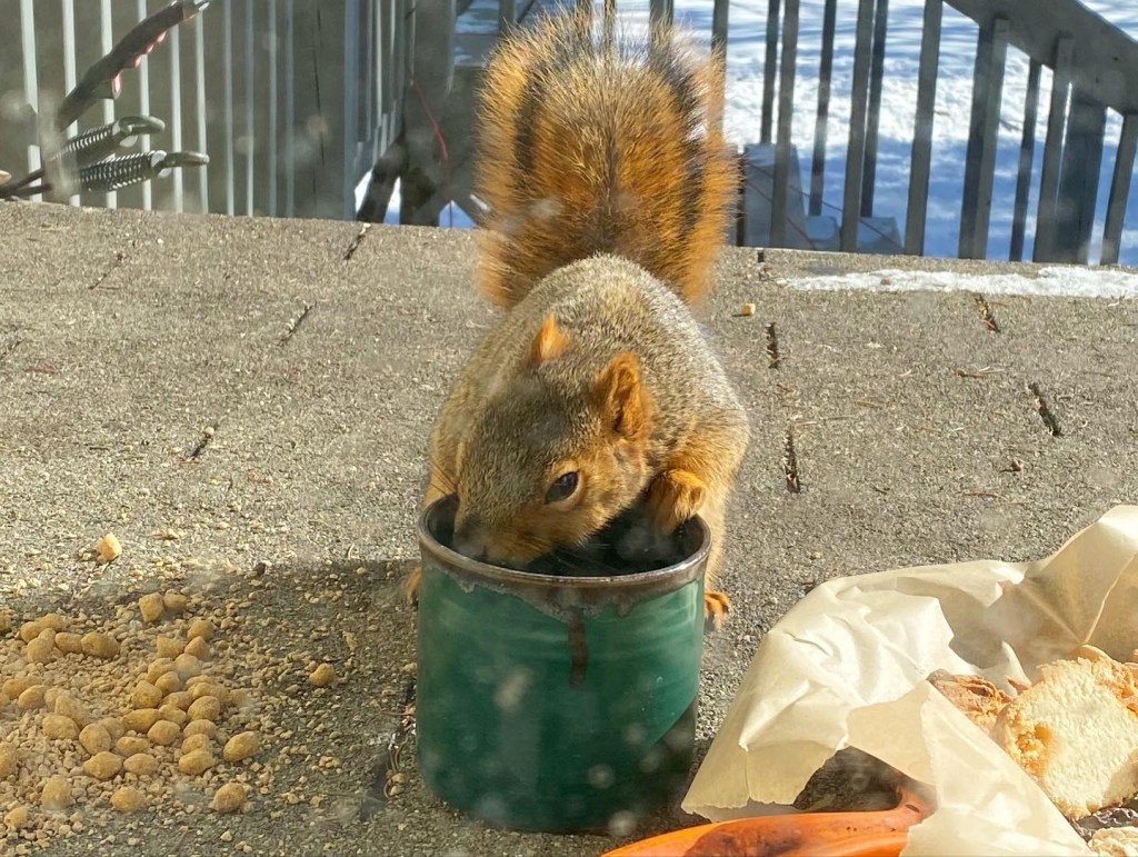 I make what I call “squirrel granola” whenever it’s really cold and the birds like it too. I save up ends of good cereals, bags of seeds and nuts and oats, dried fruits and some fresh fruits and veg which I mix together with peanut butter or almond butter and set it out in crumbles for them to find. They can’t be bothered by our dog and neighborhood cats on this perch, so it’s working well and they’ve been eating well over the last few weeks.