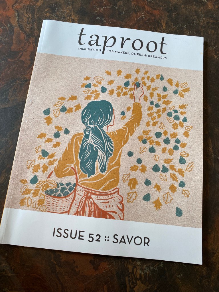 We have recently brought Taproot Magazine to our shop, and I have to say, it’s delightful to be able to find it somewhere I spend so much of my time. I used to find Taproot (Inspiration For Makers, Doers & Dreamers) at our local Barnes & Nobel and for awhile I had a subscription. I let the subscription go when we were making some life decisions, including where to live long term, and didn’t get back to it. Around the same time, Taproot pulled their magazine from big-box retailers, opting for smaller businesses like ours. This is all fine with me.